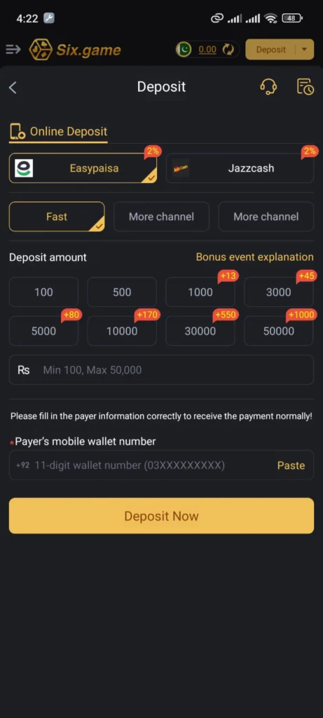 Depositing money into your Six Game account is quick, secure, and convenient. The platform supports multiple payment options like Easypaisa, JazzCash, and bank transfers — allowing Pakistani players to enjoy smooth and instant transactions. Follow the simple steps below to fund your wallet and start playing right away.