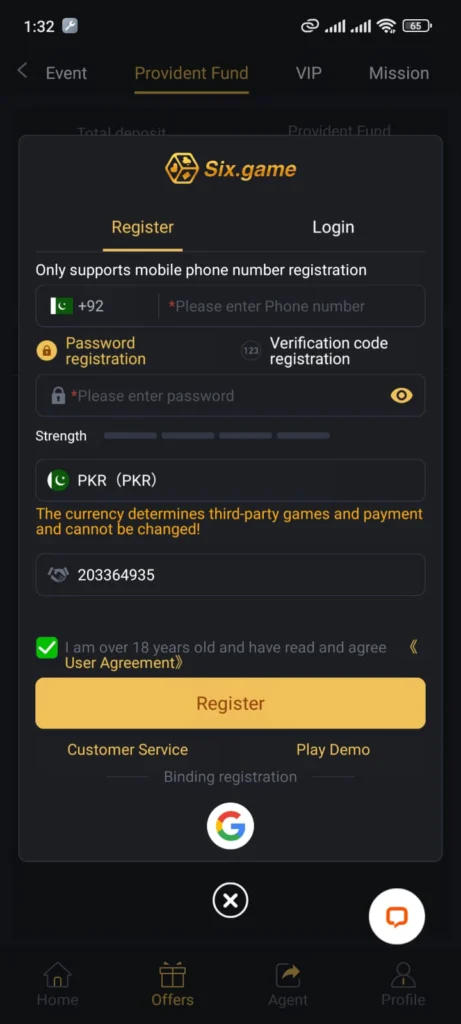 Once installed, open the Six Game App and sign up for a new account. You can register using your mobile number or email and start playing right away.